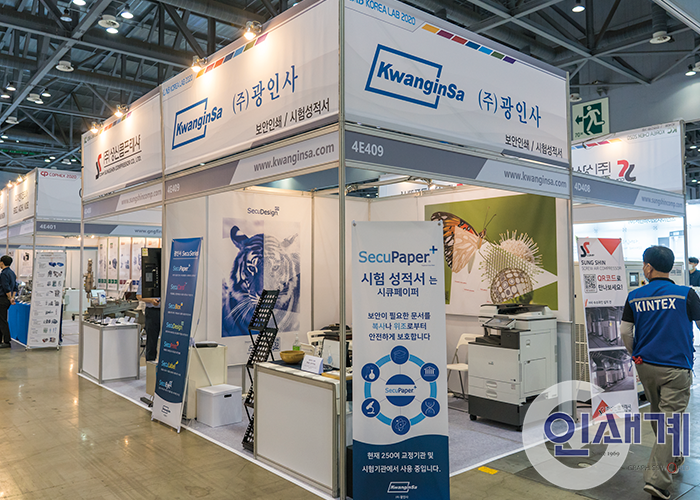 보안/특수 인쇄 전문기업 ㈜광인사(대표이사 김종현/www.kwanginsa.com)은 코리아팩과 동시 개최된 KOREA LAB 2020(국제연구·실험 및 첨단분석장비전)에 부스를 마련하고 보안 디자인과 보안 용지의 다양한 적용 범위를 관람객들에게 소개했다.