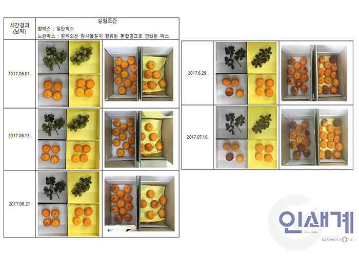 추가로, 온크씨엔피 평과 결과 원적외선 잉크로 인쇄된 박스에 과일을 보관 시 일반 대비 과일의 부패가 느려지는 것을 확인할 수 있다.
