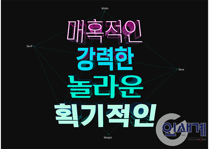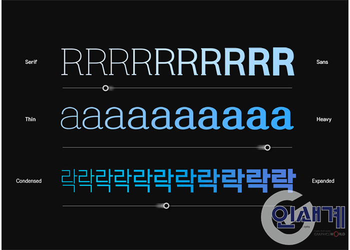 배리어블 폰트는 볼드, 미디엄, 라이트로 구분되었던 두께를, 볼드와 라이트 사이에서 그래프로 원하는 %만큼 조정해서 사용할 수 있는 특징을 가진다.