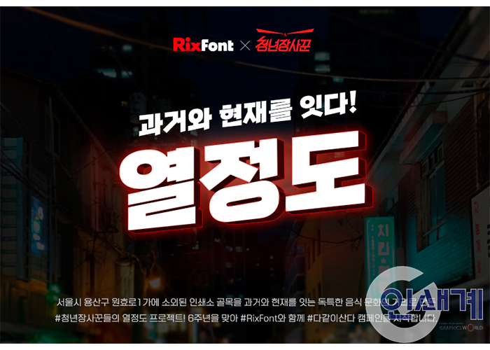 저도 폰트를 만드는 디자이너이기 때문에 의미 있는 디자인에 초점을 맞춰 제작하기도 합니다. 저희 회사 인근에 젊은 청년들이 모여 만들어진 ‘열정도’라는 골목이 있는데요, 2020년 12월 코로나 장기화로 어려움을 겪고 있는 이들을 돕고 활성화에 기여하기 위해 Rix열정도체를 제작, 무료로 배포하기도 했습니다.