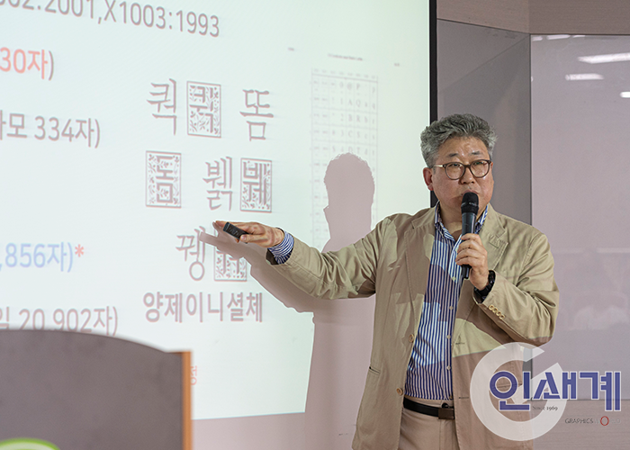 한국폰트협회에 대한 소개로 강의를 시작한 정석원 회장은, 한글 1만 5천여 종, 영문은 450만여 종이 유통되고 있는 현재 국내 폰트 시장 상황과 폰트와 관련된 서체, 글꼴, 활자, 캘리그래피, 타이포그래피 등의 용어를 설명했다.