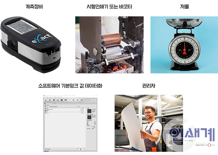 잉크 포뮬레이션을 기반으로 한 잉크 조색 시스템은 X-Rite 잉크포뮬레이션 소프트웨어와 시험 인쇄기, 계측장비 3가지로 구성된다.