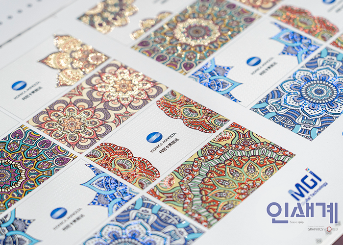 이어, “아날로그 방식의 스팟 UV 바니시보다 더욱 반짝이는 광택 효과를 얻을 수 있는 디지털 스팟 에폭시와 함께 포일 두께를 자유롭게 조절할 수 있어 그러데이션 표현이 가능하고 자신만의 차별화된 패턴을 창조할 수 있는 디지털 금/은/홀로그램 박 작업을 할 수 있는 코니카미놀타 아큐리오샤인 3600을 활용해서 소비자들에게 시각적으로 한층 더 고급스러운 촉각 느낌을 전달할 수 있는 인쇄물 제작이 늘고 있다”고 하면서, “에폭시와 박 작업을 원패스로 작업할 수 있고, 별도의 파일이 없어도 AIS 스캐너로 스캔 후 샘플을 만들 수 있다는 등의 특징을 활용해서 아날로그 방식보다 작업 시간을 크게 단축하면서 친환경적인 고품질 인쇄물을 완성할 수 있으며 여러가지 패턴 구현을 통해서 보다 특별한 한정판 인쇄물을 생산할 수 있다”며 장비가 가진 확장성에 대해 강조했다.