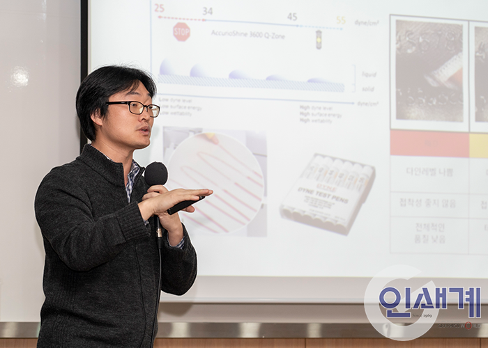두 번째 세션을 맡은 권성희 차장은 영상을 통한 아큐리오샤인 3600에 대한 장비 설명과 함께 바니시 두께와 얇은 선 구현을 위한 호일 데이터 작업에 있어 주의해야 할 사항을 주지할 수 있도록 다양한 사례와 함께 설명하고, 교육장에 배치된 책 표지와 카탈로그, 브로슈어, 상장, 명함, 패키지 등 다양한 아큐리오샤인 3600 샘플들을 참가자들과 함께 보면서 질의응답을 진행했다.