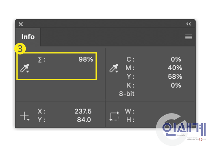 포토샵(Photoshop)에서는 아이드롭퍼(Eyedropper)와 정보 패널(Info Panel) 도구를 사용할 수 있다. 정보 패널을 사용자 지정해 항상 왼쪽 상단 부분에 총 잉크(Total Ink) 양을 표시하도록 설정한다.