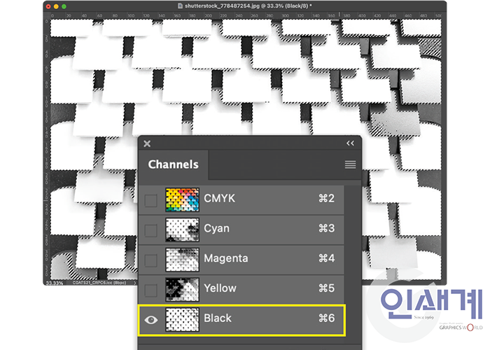 ① 문서가 CMYK 모드에 있는지 확인한 뒤, 채널 패널로 이동, 블랙 채널을 클릭 후 패널 하단의 선택 버튼을 클릭하여 영역을 지정한다.