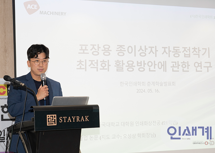 동국대학교 언론정보대학원 인쇄화상전공 석사 논문을 기반으로 ‘포장용 종이상자 자동접착기 최적화 활용 방안에 관한 연구’라는 주제 발표에 나선 ㈜에이스기계 이승환 실장은 “패키징 시장에서도 친환경 요구 증가하고 있으며, 팬데믹으로 지속적인 성장을 이어가고 있다”고 하면서, “패키지 사용 증가로 인해 자동접착기 시장도 아시아태평양과 북아메리카, 유럽을 중심으로 성장하고 있다”고 말하고 자동접착기에 대한 기계적인 구조를 설명했다.