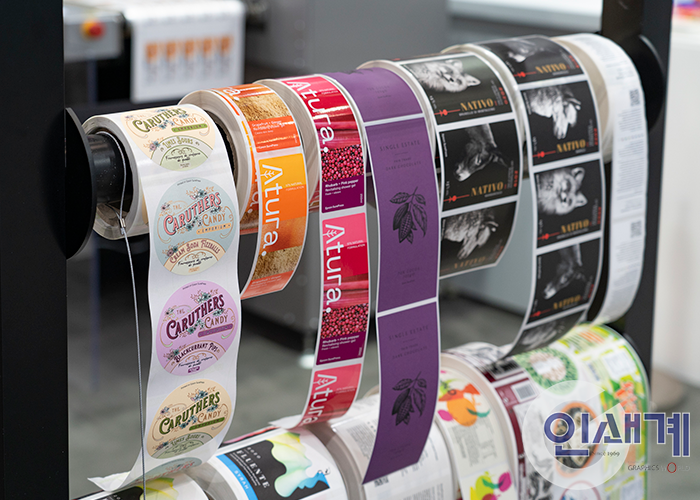 다양한 소재의 라벨 샘플을 전시해서 친환경적이면서 고급스러운 인쇄 품질을 구현할 수 있다는 점을 설명했으며, 수성과 UV 잉크 기반 라벨 프레스 모두에서 보다 차별화된 시장 경쟁력을 가질 수 있다는 점을 강조해서 새로운 제품에 대한 고객들의 기대감을 높였습니다.