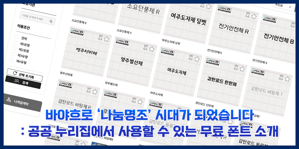 공공누리(Korea Open Government License, KOGL)는 공공저작물 배포를 허용하는 저작권 라이선스 중 하나로, 공공저작물을 대상으로 하는 대한민국 문화체육관광부에서 개발한 라이선스입니다. 폰트 외에도 이미지, 영상, 오디오. 3D 등이 소개되어 있습니다. 특히, 243개의 지방자치단체 중 81곳의 지자체가 폰트를 개발해 무료로 배포하고 있는데, 공공누리 ‘공공안심글꼴’에서 다운로드가 가능합니다. ‘안심글꼴파일 서비스’에서는 안심글꼴 한번에 내려받기도 가능합니다. 지방자치단체 뿐 아니라 공공기관에서 개발하여 무료로 배포한 폰트까지 183종이 현재 배포되고 있습니다. OFL(Open Font License)라고 하여 해당 폰트를 그대로 판매하지 않는 한 자유롭게 이용 가능한 폰트도 117종이 다운로드 가능합니다.