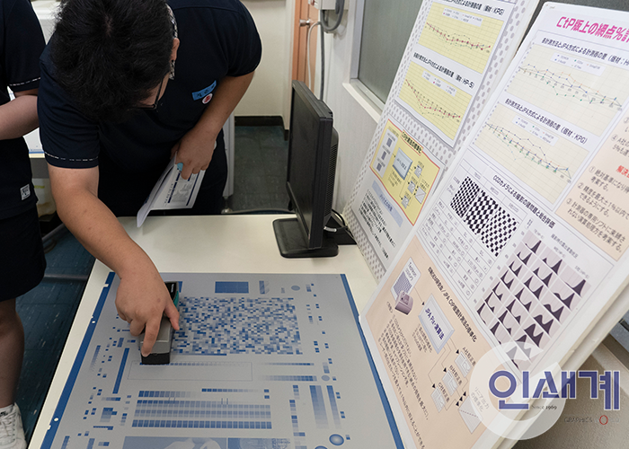 인쇄의 변수를 최소화하고 디지털 워크플로우를 구축해서 고품질의 일관된 인쇄물을 제공하고 있는 우에마츠 인쇄는 인쇄기에 장착된 분광 광도계로 컬러바를 스캔하고 밀도, 도트 게인 및 색상 차이와 같은 색상 관리 데이터를 측정한다.