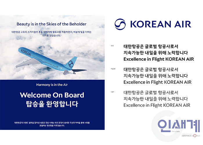 대한한공 특성에 맞는 글로벌한 감성을 라틴과 한글에 어떻게 일관성있게 표현하느냐가 큰 관건인 프로젝트였습니다. 대한항공 메인 로고와 일관성있게 한국적이면서 항공사만의 아이덴티티인 날개의 이미지를 구현하여 디자인 했습니다. 최근 주요 기업 브랜드가 추구하는 모던함과 미니멀리즘 트렌드를 추구하면서도 대한항공 고유의 헤리티지(Heritage)를 계승한 것인데요, 태극마크 옆 항공사명을 보여주는 로고타입 ‘KOREAN AIR’의 디자인은 최고의 국적 항공사다운 격식을 갖추면서도 개성을 놓치지 않았으며, 서체 끝에 적용된 붓터치 느낌의 마무리와 부드러운 커브, 열린 연결점 등으로 한국식 우아함을 현대적으로 표현했다고 평가받고 있습니다.