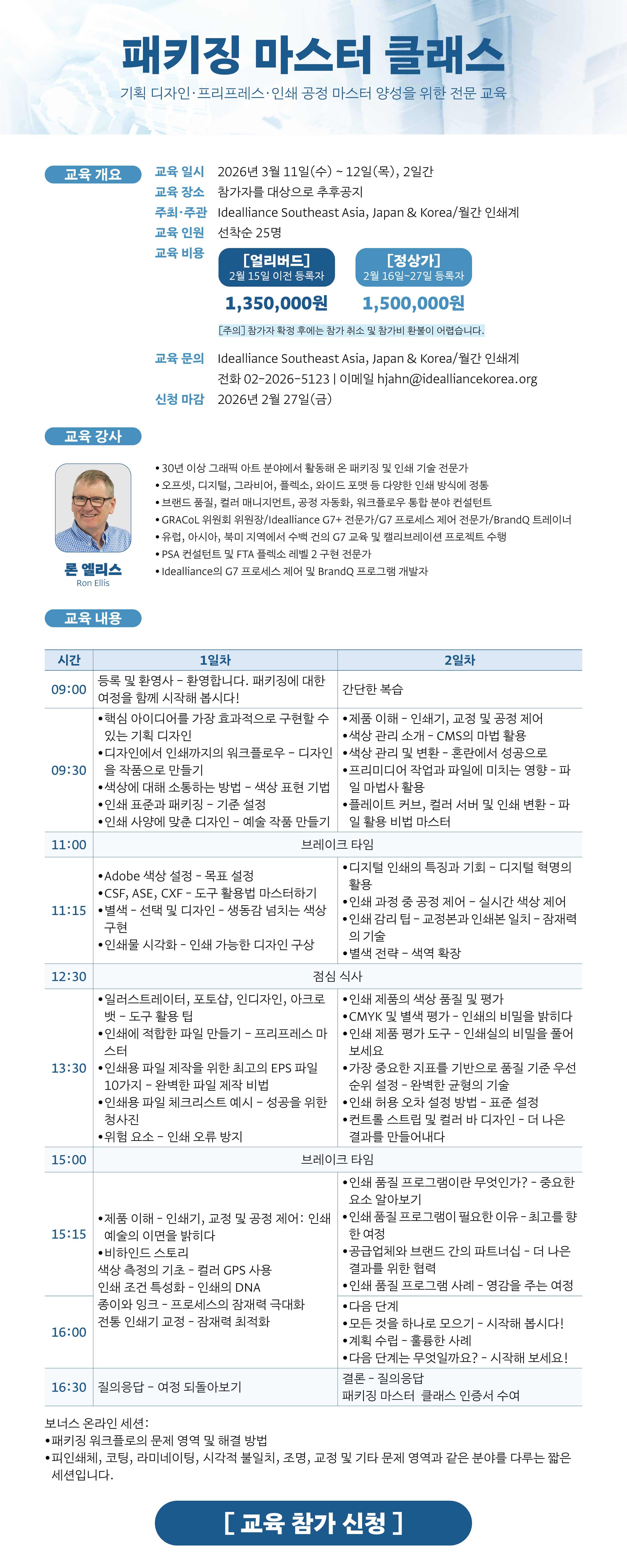 글로벌 패키징 인쇄 분야에서 가장 권위있는 패키징 전문가 양성 프로그램인 패키징 마스터 클래스가 국내에서 처음으로 오는 3월 11~12일 서울에서 개최됩니다. 본 프로그램은 2019년 미국에서 시작되어 지난 6년간 미국과 유럽에서 검증된 과정이며, 아시아에서는 한국이 첫 개최지입니다. 교육은 인쇄 표준 및 패키징 교육 분야의 세계적 권위자인 론 엘리스(Ron Ellis)가 직접 진행합니다. 패키징 분야에서 역량을 강화하고자 하는 모든 분들의 참여를 환영합니다! 자세한 사항은 아래 내용을 참고하시기 바랍니다.